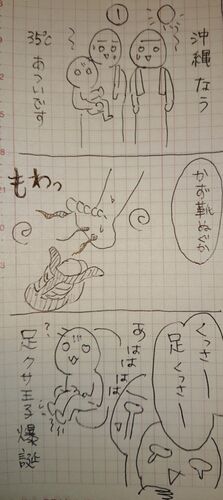 突然ですが、今日から沖縄旅行です! 今日、明日、明後日とほぼ日に書いた4コマ漫画を毎日更新します。 一発書きで文字手書きで読みにくく、申し訳ありません。素足に履いてたらめっちゃ臭かったです。 てかこんなネタかーい!足ネタ続くんかーい! ここから…