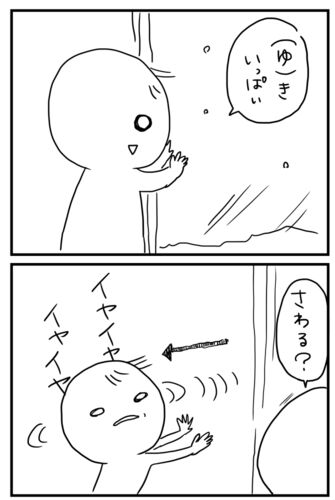 愛知でも雪が降りました 北海道で、「ゆきいっぱい」を覚えてきたので、 さっそく言っていたかず。 「ぅき」もしくは「き」いっぱい。だそうです。 本日は2コマです。 冷たいからイヤみたいです。 生まれは北海道なのに、雪はダメなようでした。